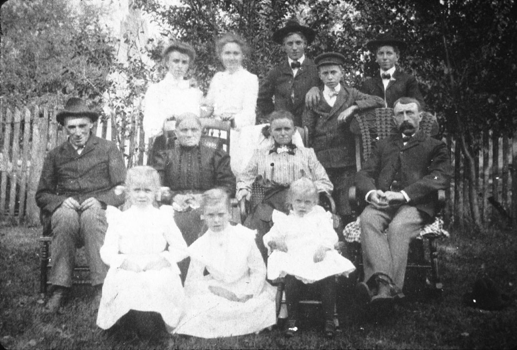 Blomenberg family 1905: (seated middle row: Diedrich Scheumann (blind uncle of Frederick), Wilhemina Horstmeyer, Wilhemina "Mina" Witte, Frederick Blomenberg; (back row standing), Pauline, cousin Bertha, August, Martin, Albert (who took this picture with timer); (children seated in front) Clara (age 10), Adele, Meta (on lap of mother "Mina")