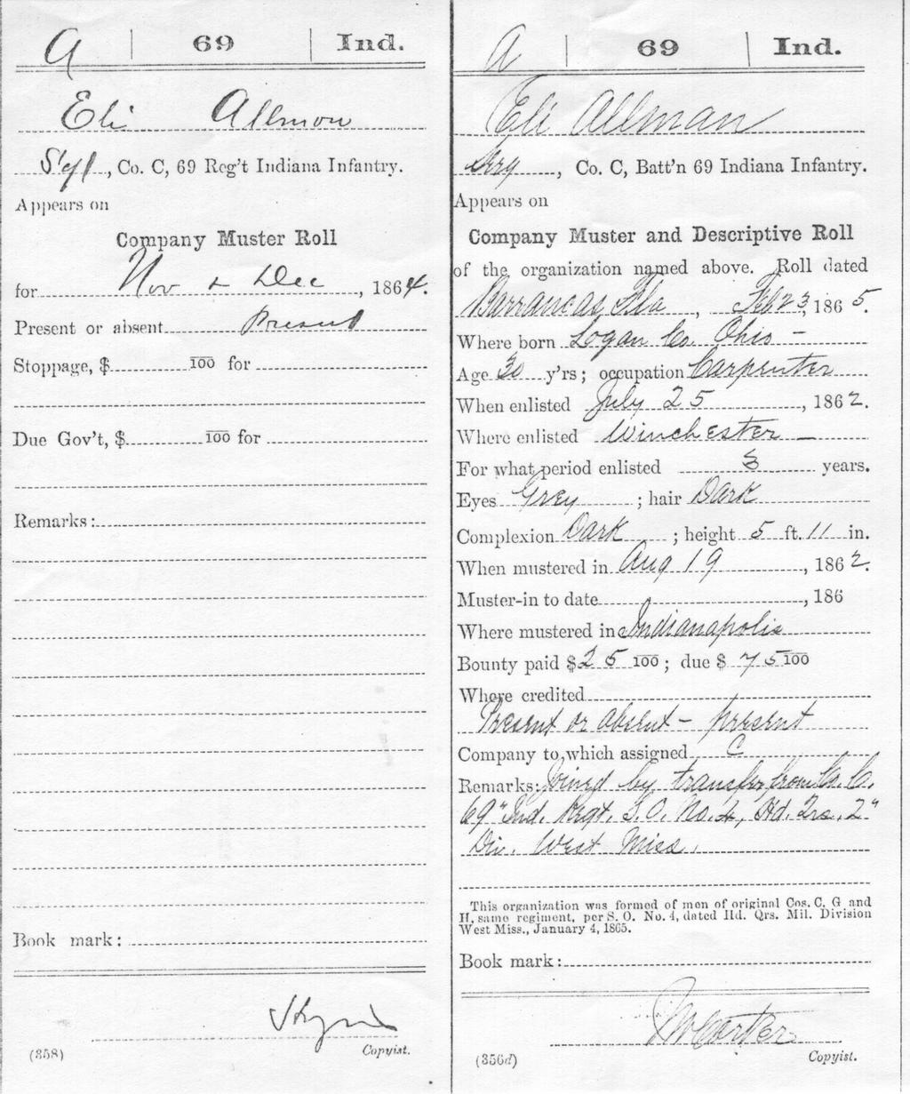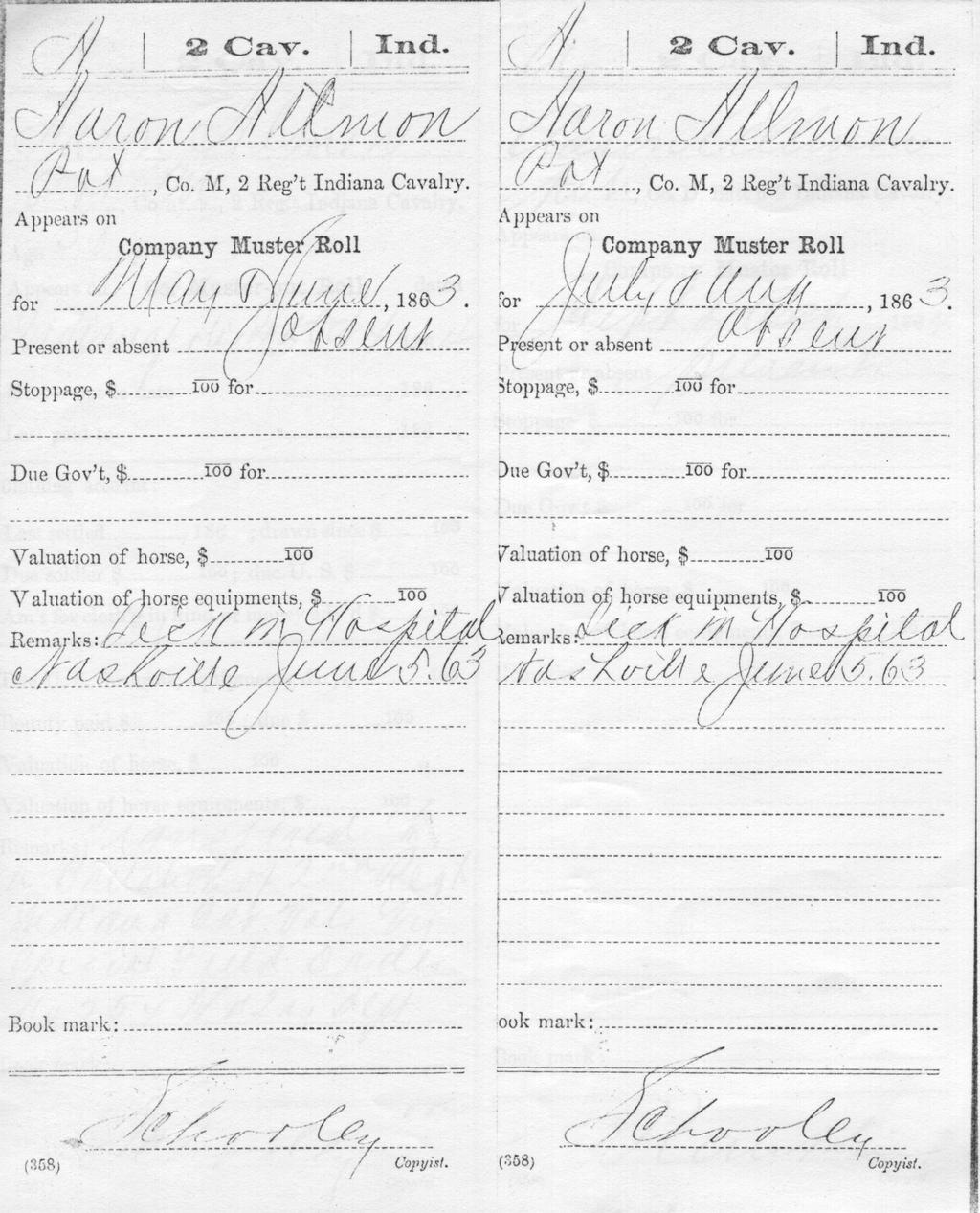 Aaron Allmon served in the 2nd Indiana Cavalry Regiment. His Volunteer Enlistment form shows that he joined at Indianapolis on Oct. 22, 1862, for a 3-year enlistment, born in Columbus County, Ohio, "aged twenty two years" (but was actually born in 1830 and later muster rolls record his age differently), with blue eyes, auburn hair, light complexion, 5' 7" in height. He was mustered into Company M, 2nd Indiana Cavary Regiment, at Indianapolis Nov. 4, 1862, with the rank of Private and was paid a bounty of $25. His occupation was listed as farmer. He may have been on leave until the end of December. His muster roll record shows he was present for duty from Jan. to Apr. 1863, was absent from May to Dec. 1863, "sick in hospital in Nashville" for 5 months (Aug., Sept., Oct., Dec. 1863 and Jan. 1864) due to "chronic diarrhea" and his character while in the hospital was noted as "good." he was "absent dismounted at Knoxville" in Feb. 1864. "Certificate furnished in lieu of lost discharge Aug. 14, 1864." He was "transferred to a Battalion of 2nd Regt. Indiana Cavalry by special field order No. 254 . . to Dept. Cumberland dated Sept. 14, '64 and by special field order No. 112 . . . Chief of Cavalry Dept. of the Cumberland dated Sept. 17, '64." He was present for duty from Sept. 1864 to his discharge July 22, 1865, at Nashville. "Daily duty Farrier for the Battalion" (a farrier was responsible for the full range of horse care). On discharge he was "charged with 1 sabre and belt, 1 Colt revolver retained." After Chickamauga in 1863, the 2nd Indiana marched with Sherman to Atlanta, was reorganized into a battalion of 4 companies in Sept. 1864, was at Cartersville September 20, Camp Creek September 30, against Hood in North Georgia and North Alabama in October, moved to Louisville, Ky., to refit, pursuit of Lyon from