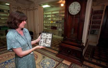 Preservation officer Susan K. Brown holds a photograph of one of the rooms in the Eisenhower Executive Office Building Thursday, Aug. 17, 2000 in Washington. "The character of this building is as strong as it's structure," she said of the building originally constructed in the late 1800s to house the departments of State, War and Navy (AP Photo 8/21/2000)
