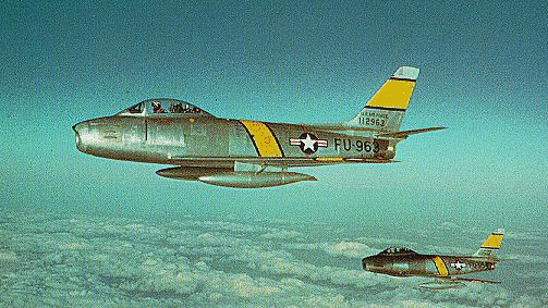 | 1947/10/1 - North American flew America's first swept-wing fighter the F-86 Sabre jet. over 10,000 would be produced for service in the Korean War 1950 and stay in use until the 1970s. | |