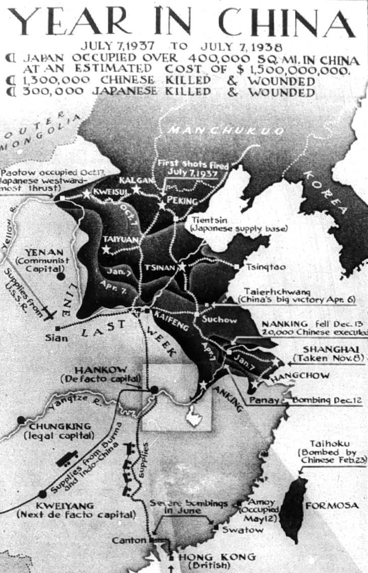 "War in China July 7, 1937, to July 7, 1938" map of "Last Weeks Fighting" with Panay location Dec. 12, 1937, from Time July 1938 - bg