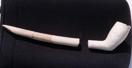 Pieces from two different clay smoking pipes from the remains of a fort built in the 1670's on the Mashantucket Pequot reservation in Connecticut