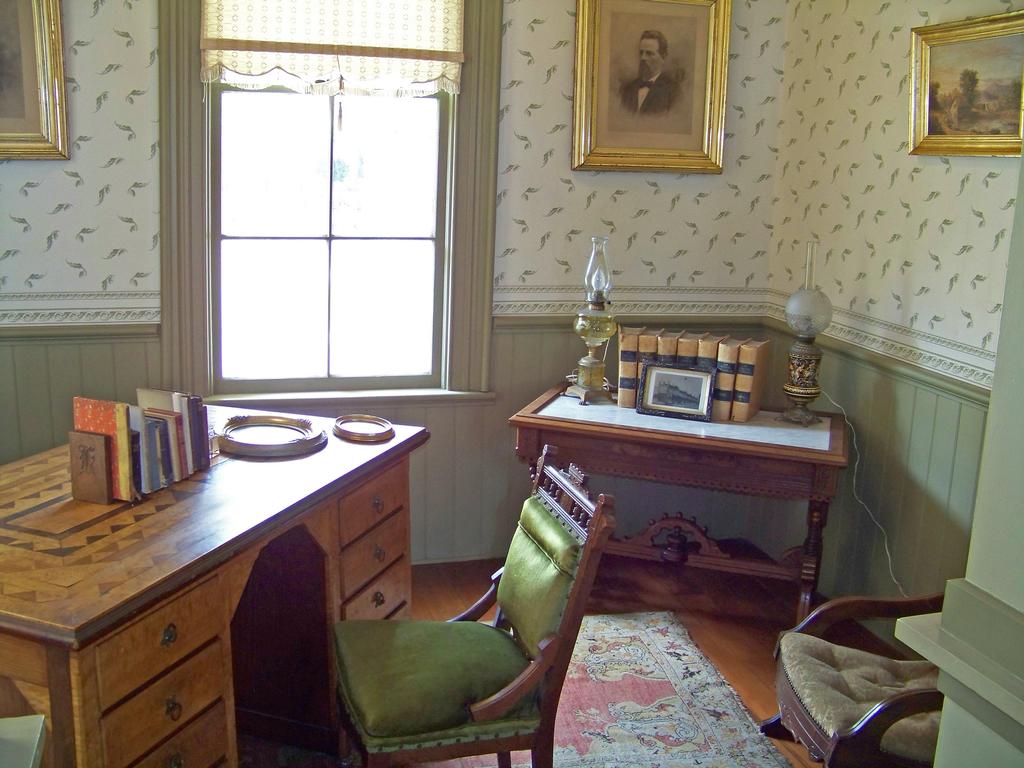 ![]() Under a portrait of Sarah on the front wall, the double-sided wood desk built by Warren at his planing mill still stands in the front room of the Kimball house> Reflecting their busy life and close relationship, it could seat both Frank and Sarah at the same time.