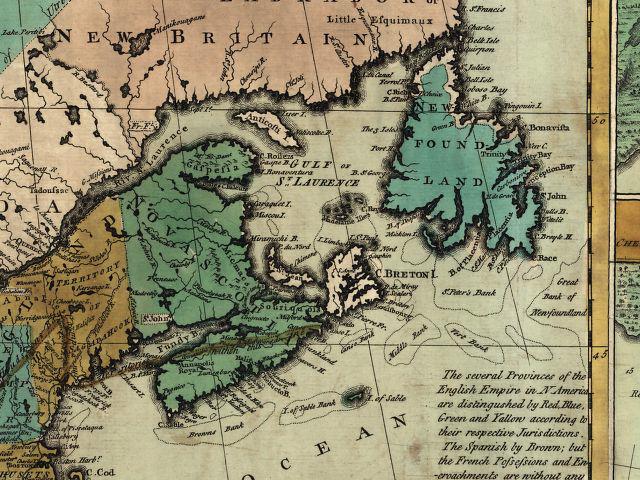 | "A new map of Nova Scotia, and Cape Breton Island with the adjacent parts of New England and Canada, composed from a great number of actual surveys; and other materials regulated by many new astronomical observations of the longitude as well as latitude; by Thomas Jefferys, geographer to the King." Printed & sold by R. Sayer & J. Bennett, London, 1775. Hand colored. Relief shown pictorially. Shows Maritime Provinces, New England, and St. Lawrence Valley region to Montreal. From the author's The American atlas. 1775. DIGITAL ID: g3420 np000010 URL: http://hdl.loc.gov/loc.gmd/g3420.np000010 SOURCE: Library of Congress Geography and Map Division Washington, D.C |