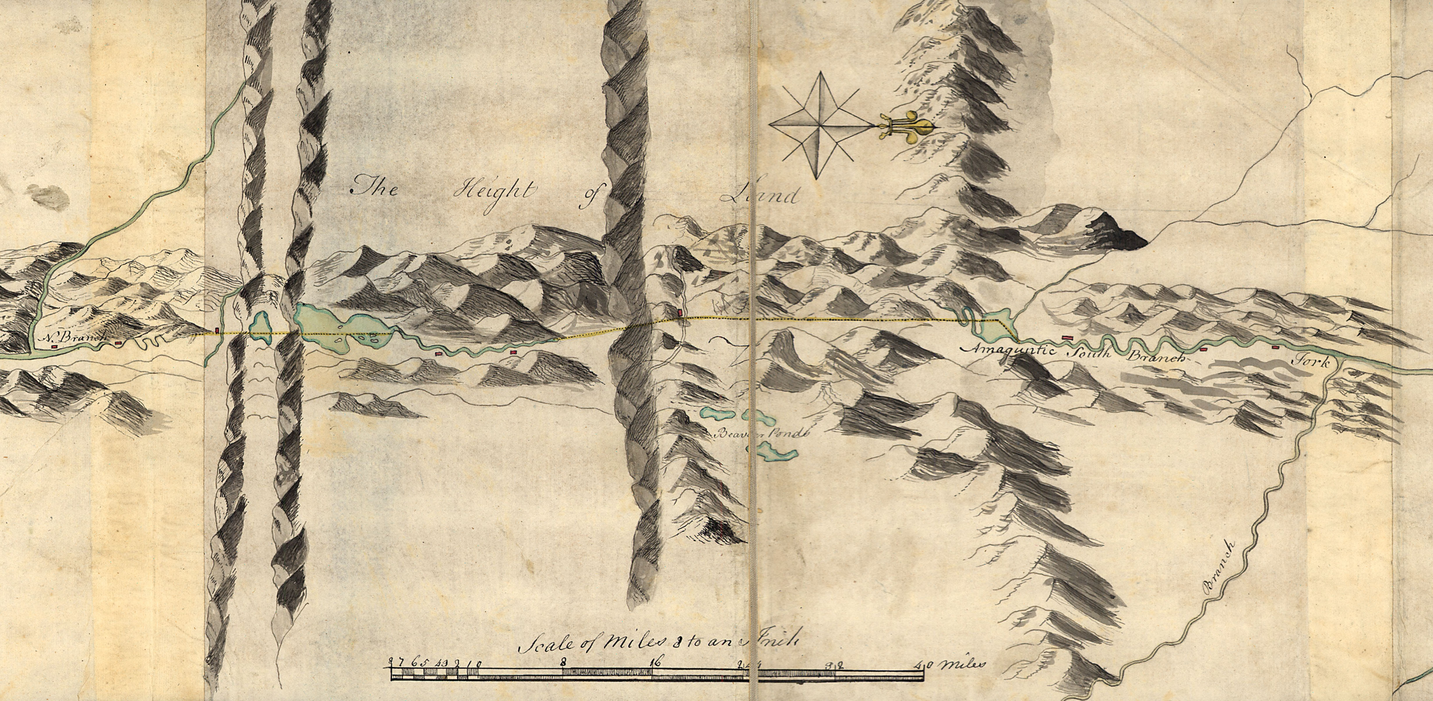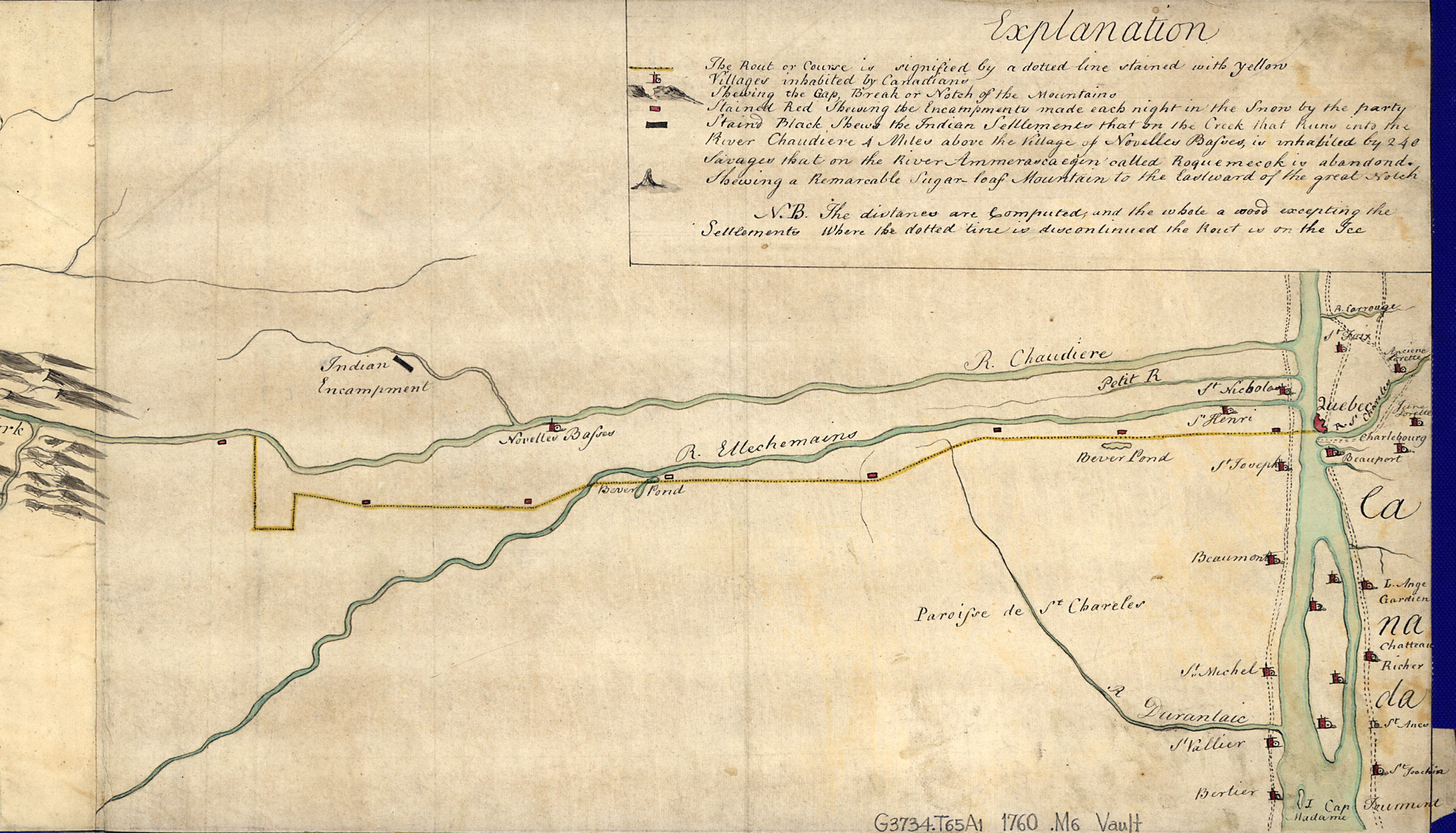 | Plan of a rout undertaken in winter, Jany. 26th, from Quebec, the capital of Canada, to the frontier settlements of the Township of Topsham near Brunswick Fort on the River Ammerascaegun in the Province of New Hampshire, Feby. 20th 1760. By John Montresor, sub. engr. & lieut. (1736-1799). Manuscript; pen-and-ink and watercolor. Oriented with north to the right. Relief shown pictorially. DIGITAL ID: g3734t ar080800 URL: http://hdl.loc.gov/loc.gmd/g3734t.ar080800 SOURCE: Library of Congress Geography and Map Division Washington, D.C |