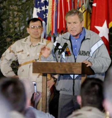 President Bush surprises U.S. troops stationed in Iraq with a secret Thanksgiving Day visit to personally honor their service and sacrifice, at the Baghdad International Airport, November 27, 2003. The president arrived in Iraq unannounced and spoke while standing next to U.S. Army Gen. Richard Sanchez (L). Bush was in Iraq for two hours and 32 minutes. (Larry Downing/Reuters) -Fri Nov 28, 2003