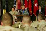 U.S. President George W. Bush, center, is joined by Gen. Ricardo Sanchez, left, and US Civilian Administrator to Iraq Ambassador Paul Bremer, right, at Baghdad International Airport Thursday, Nov. 27, 2003 in Baghdad, Iraq. Bush paid a surprise Thanksgiving day visit to American troops in Baghdad, flying to Baghdad to visit U.S. troops station in Iraq for Thanksgiving holiday. (AP Photo/Pablo Martinez Monsivais) -Thu Nov 27, 2003